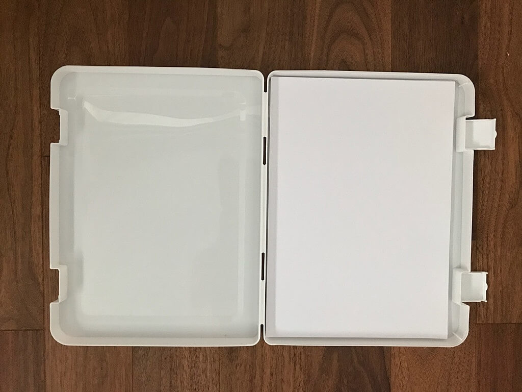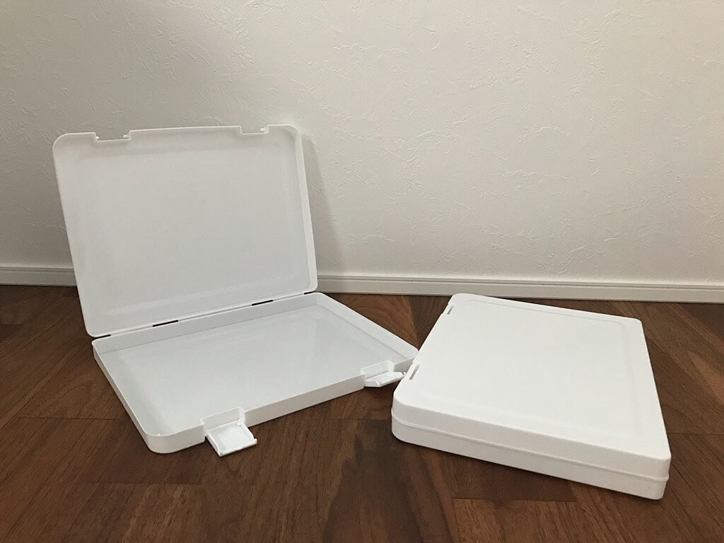 実は、透明や半透明の物は無印良品「自立収納できるキャリーケース」含め、よく見かけるのですが、透けてないホワイトが100円ショップで見当たらず。そんな中、セリアでやっと発見(行きつけのセリアにやっと入荷!?)。