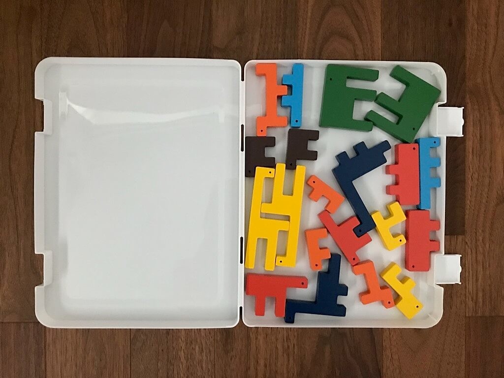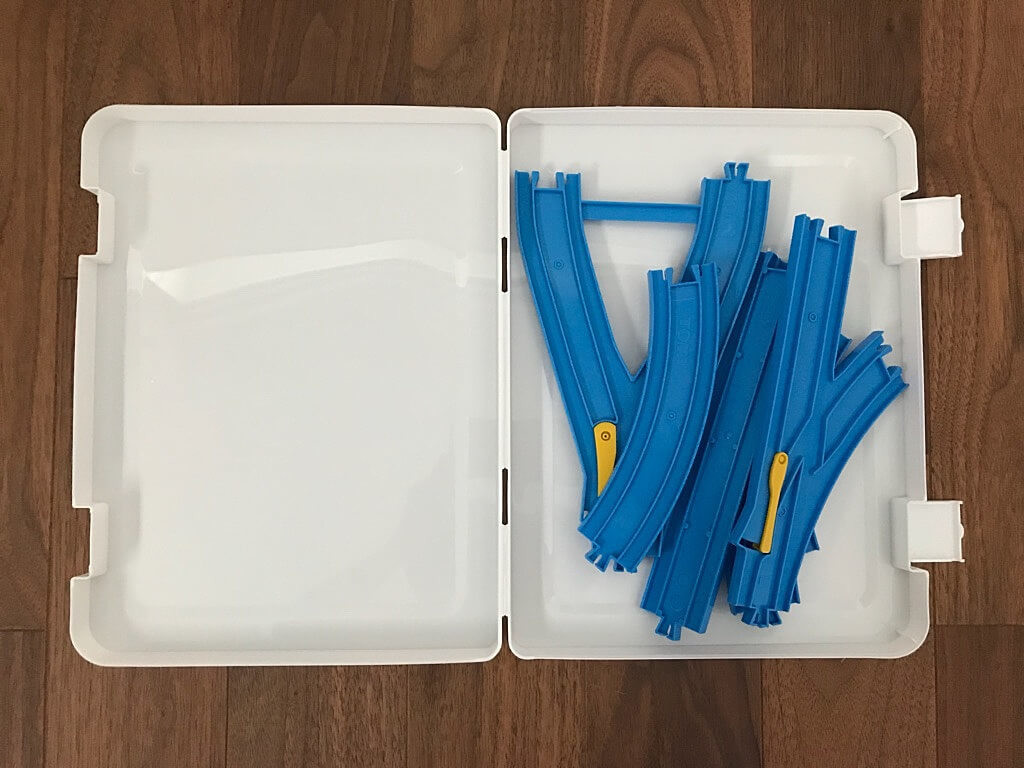 すごくコンパクトにまとめられて更にこのケースのいいところは立てて収納できるところ。 おもちゃを立てて収納できるなんて、意外な収納法ですよね。