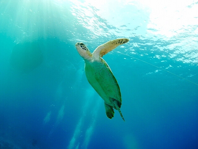 めずらしい生物を見たらついつい近づきたくなる気持ちもわかりますが、ウミガメに出会ったら、最低3メートル以上の距離で見守り、イルカやクジラは最低45メートル以上の距離から眺めましょう。