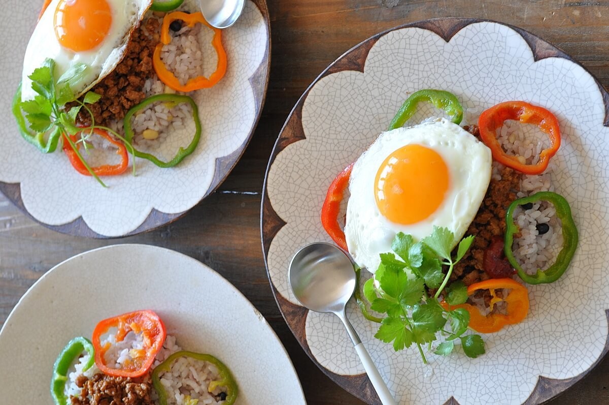 桶に人数分作ってもいいでし、プレートに一人分ずつ取り分けても。たまごそぼろを目玉焼きにしてもとっても美味しいです。