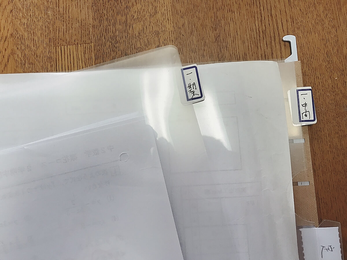 さらにひと工夫!定期考査には中間と期末があるので、100均のクリアファイルにインデックスを貼って、分別しています。
