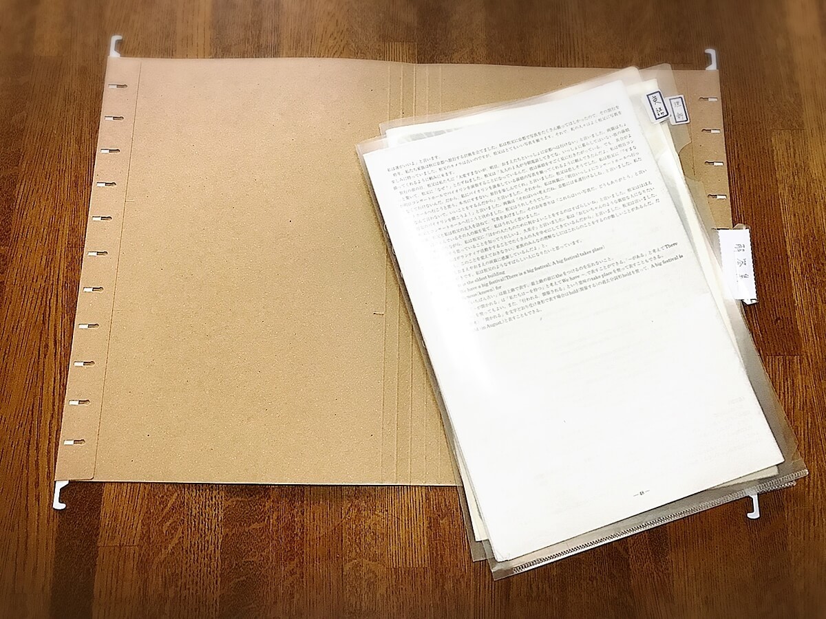 ハンギングホルダーに入れるものは、定期テストや実力テストで返却されたプリント、解答集、成績表など。