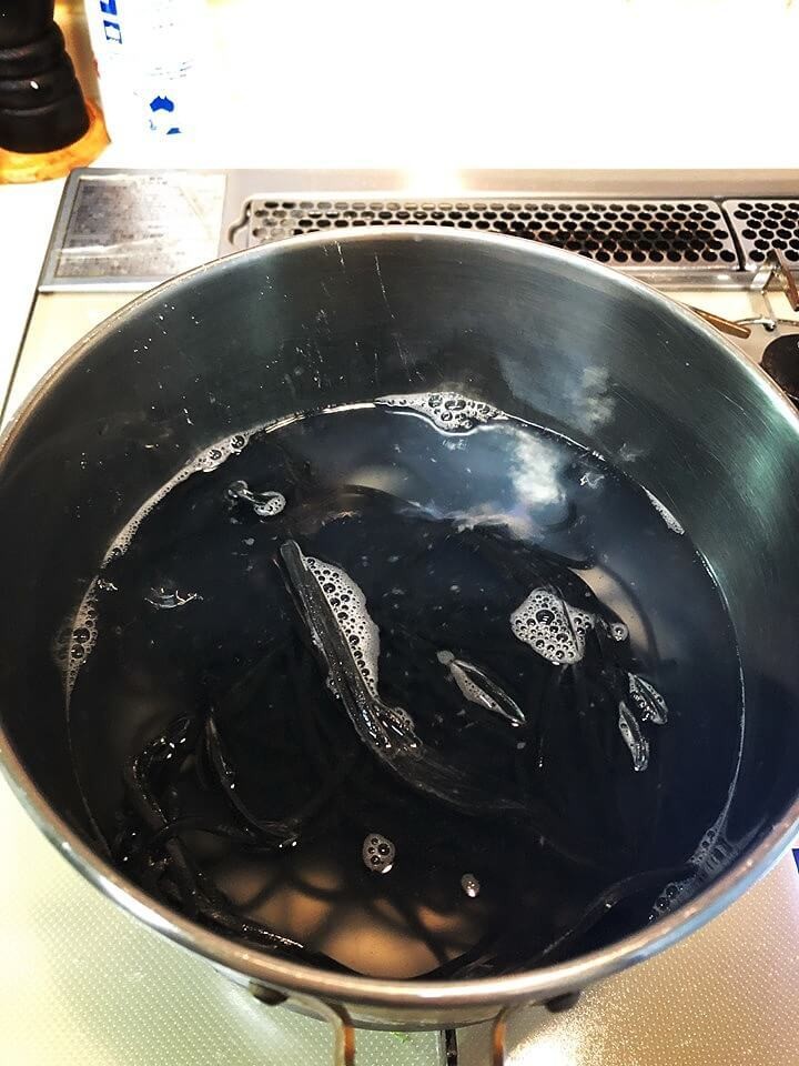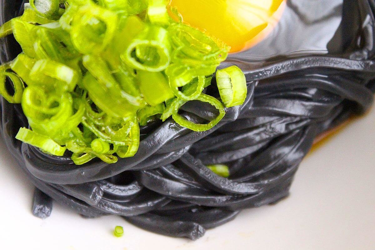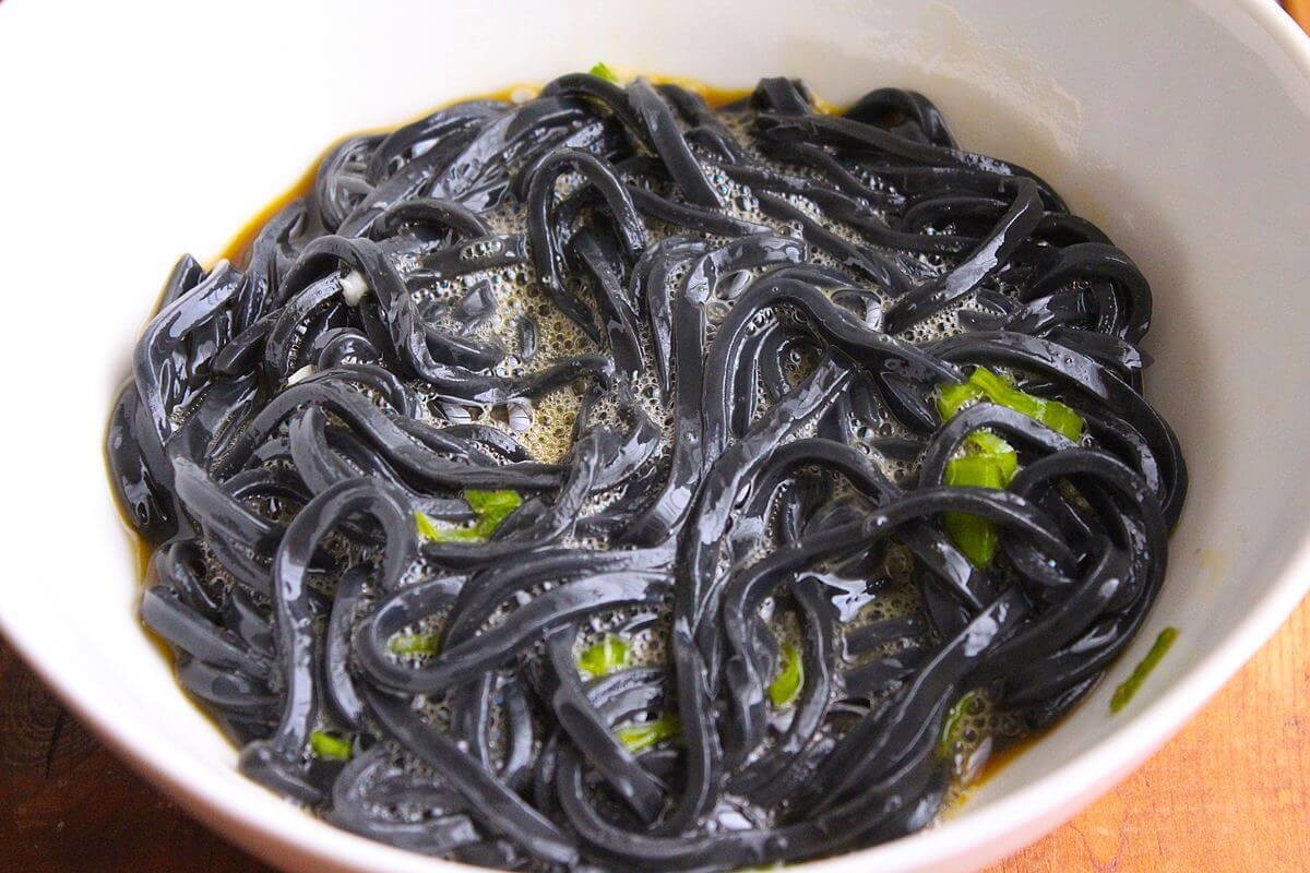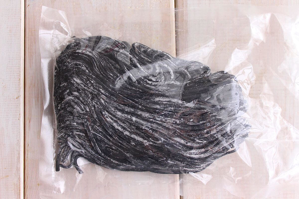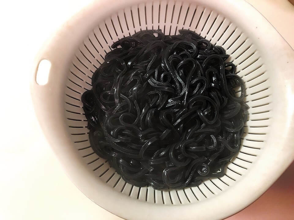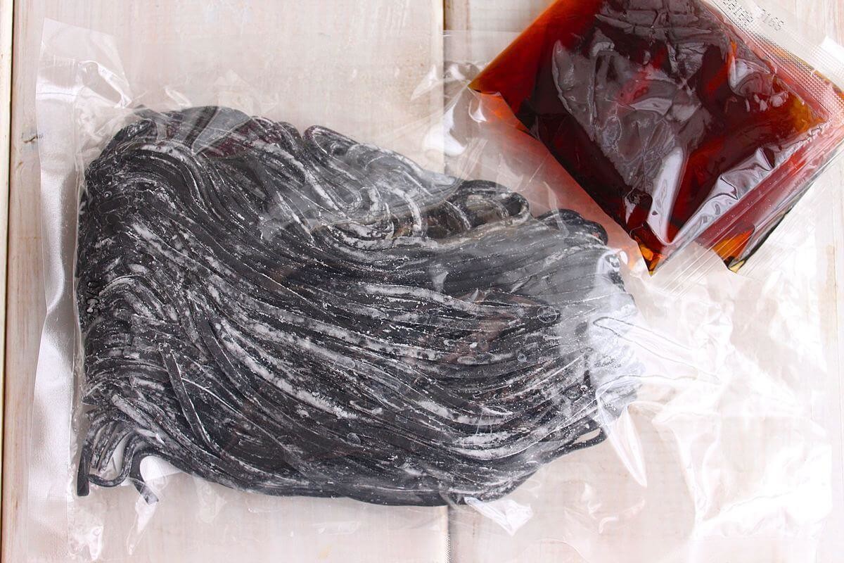 パッケージには、イカスミパスタみたいな真っ黒のうどんのビジュアルが…。