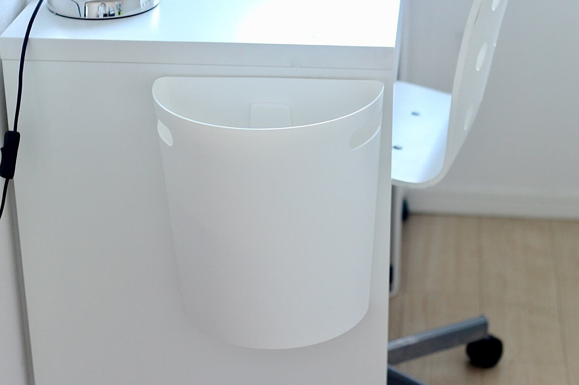 ちなみにフックに引っ掛けてあるので、ゴミを回収するときなどは簡単に取り外せますよ。 ゴミ箱が近くにあると圧倒的にラク!子どものデスクで実感しました。