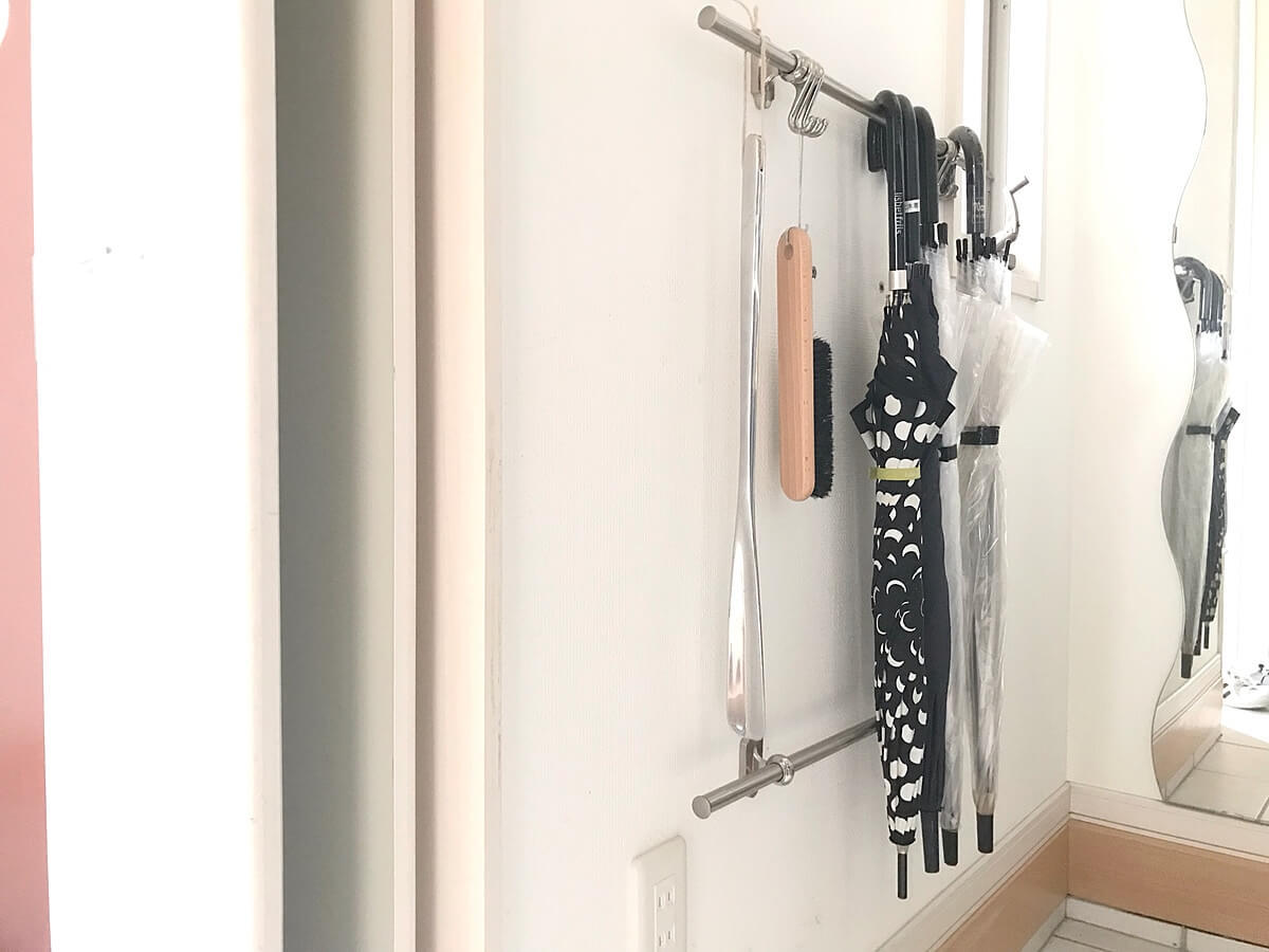 玄関では、傘を傘立てに入れるのではなく、壁につけたレールに吊るして収納しています。