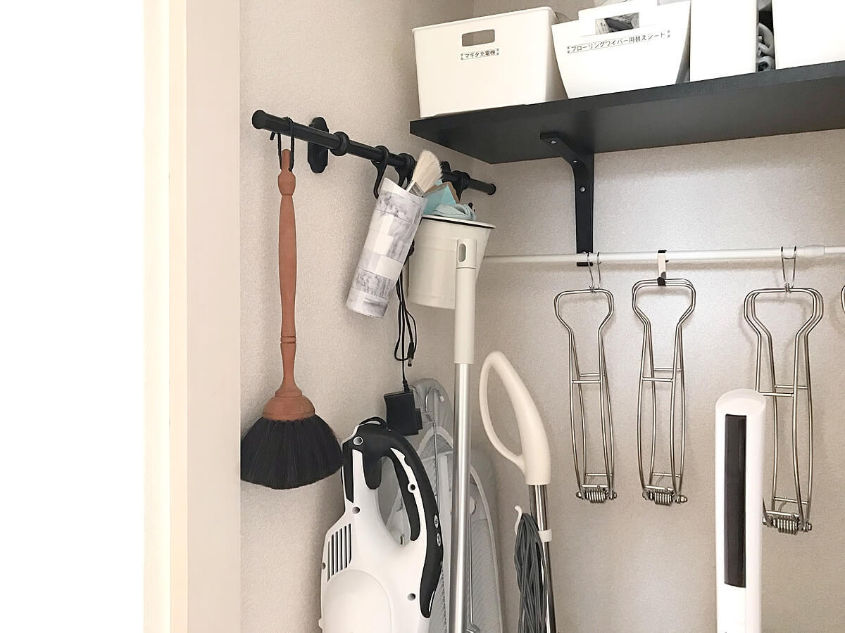 2.掃除用品をブラックのレールに吊るしておしゃれ収納!
