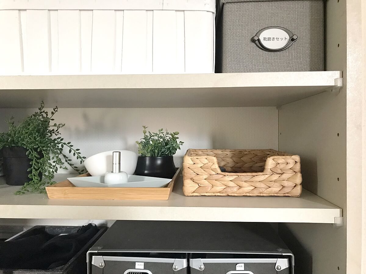玄関全体は実用的なものが多く殺伐としがちなので、白やグレーなど好きな色の収納グッズで統一しています。