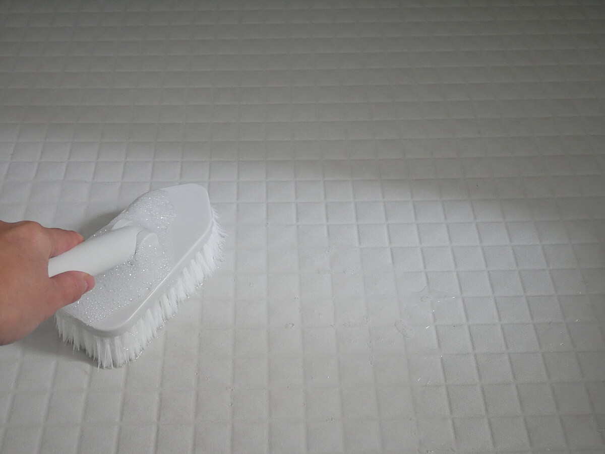 先ほど作ったオキシクリーンにブラシを浸し、ブラシについたオキシクリーンをタイルに伸ばしていきます。