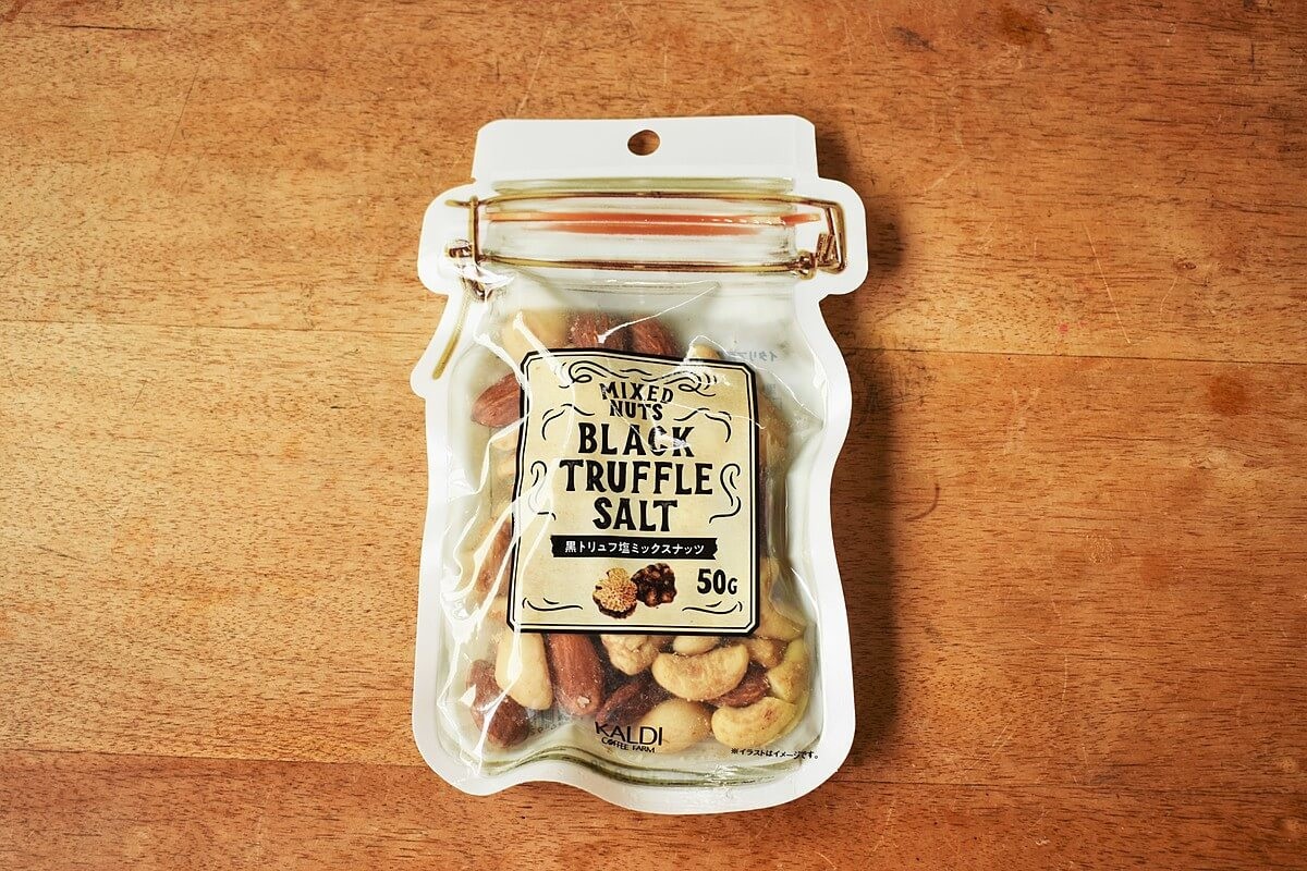 「か、かわいい!」と思わず手に取ってしまうパッケージは、カルディオリジナル「黒トリュフ塩ミックスナッツ」。