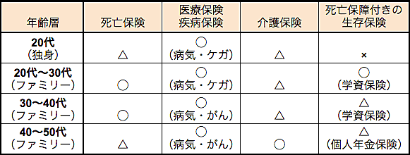 また、備えなければならないリスクは被保険者の世代や家族構成によっても変わってきます。一般論としてですが、世代別に保険に加入するタイミングについてまとめました。