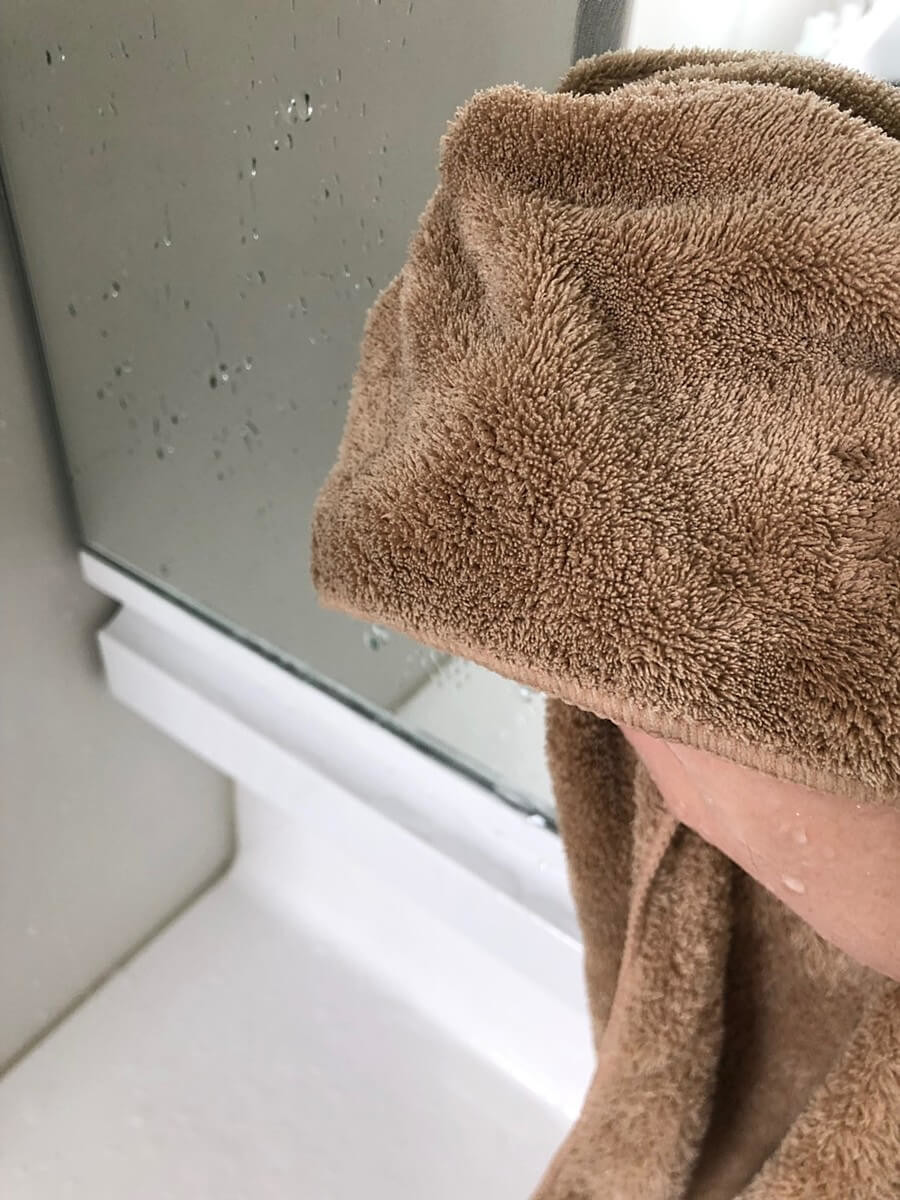 さっと流して、蛇口や鏡に飛び跳ねた水滴はハンドタオルで拭き取ります。