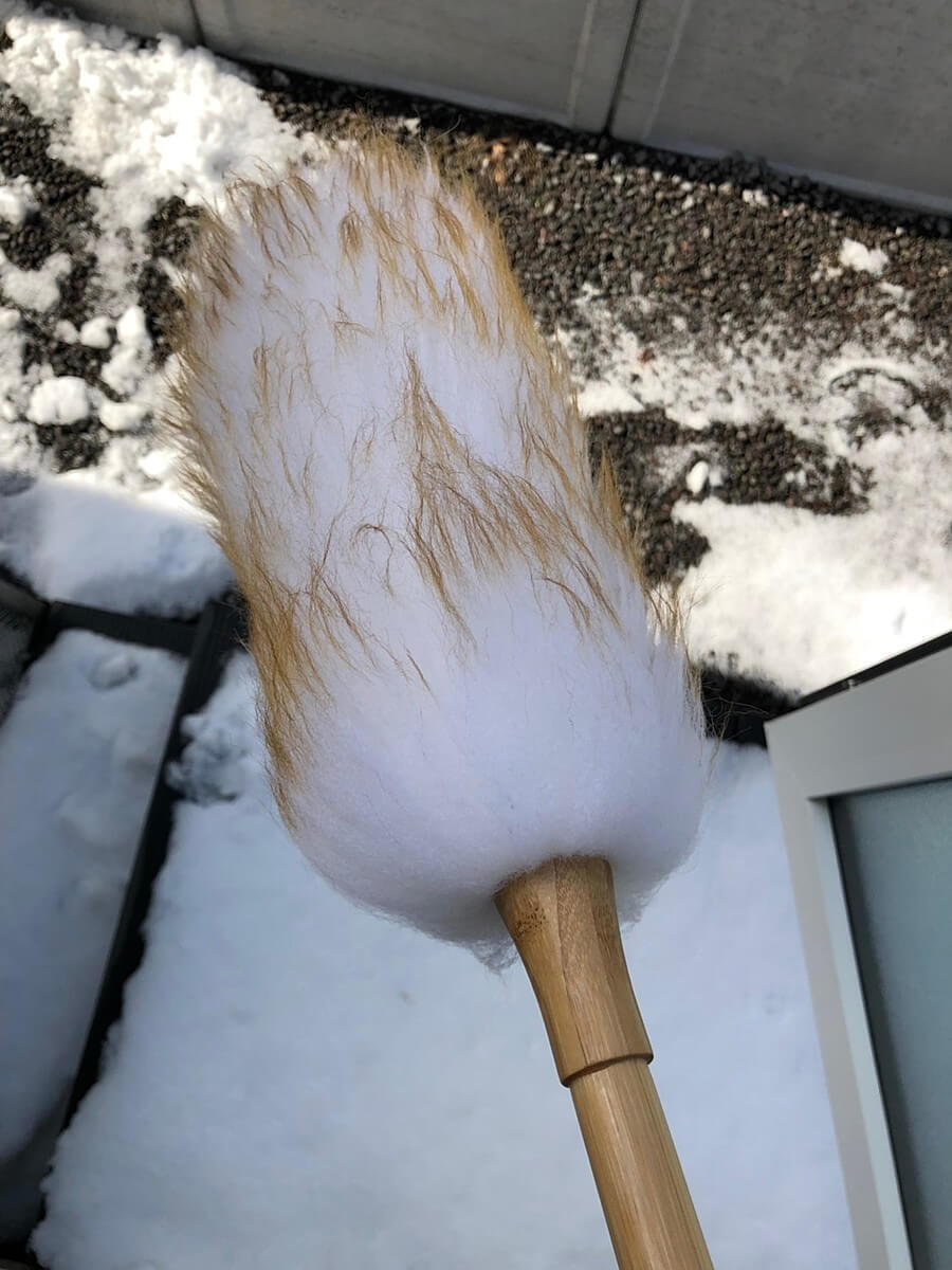 ホコリがついたら外で柄の部分を両手で持ってクルクル回せばOK。