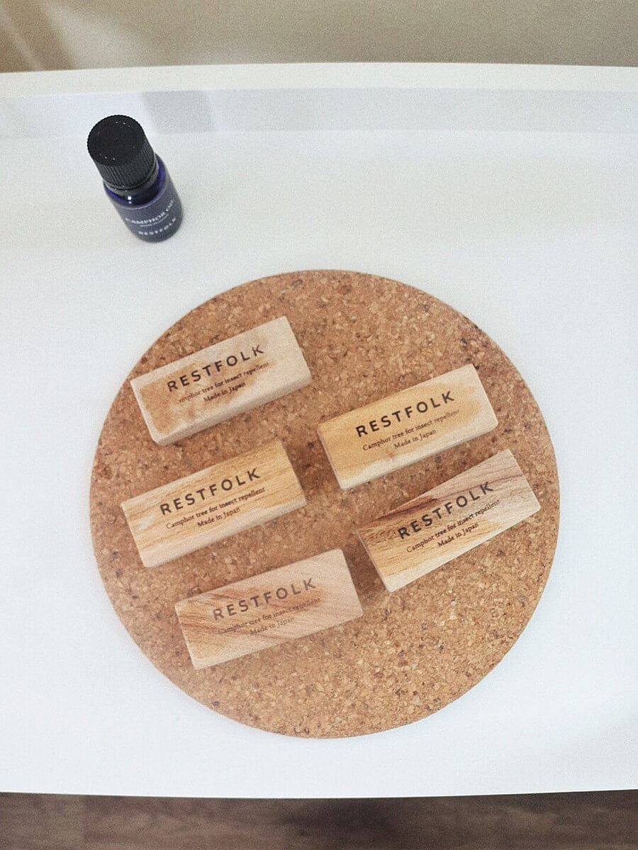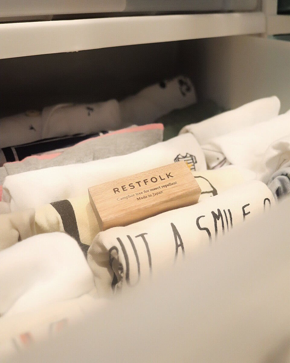 同シリーズのカンフルツリーブロックにカンフルオイルをすりこみ、チェストの引き出しに入れておきます。 ポンと入れておくだけで防虫してくれるのでありがたい! 強い香りではないので、衣類へのにおい移りも気になりません。