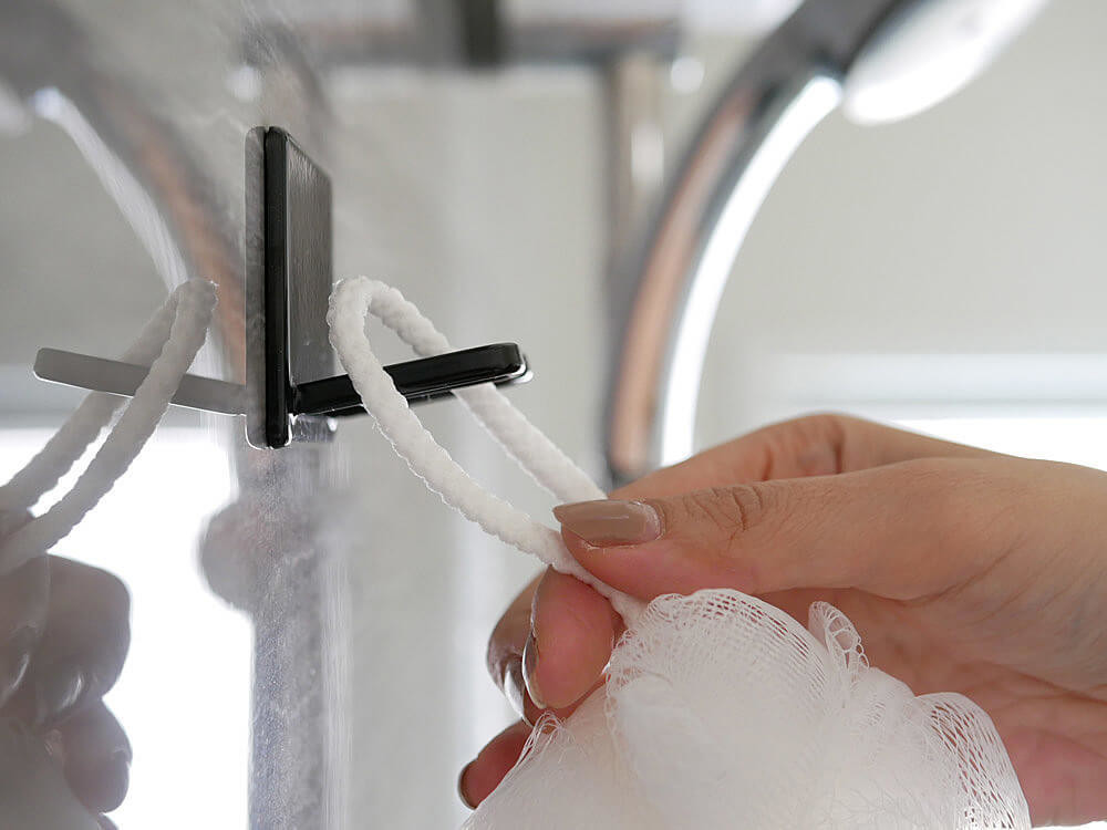 フックの凸部分を利用して、ループ状の紐などを吊るして小物を収納できる便利なホルダー。こまごましたバス小物も掛けて収納できて、水切れもよく清潔に保てるのが魅力です。