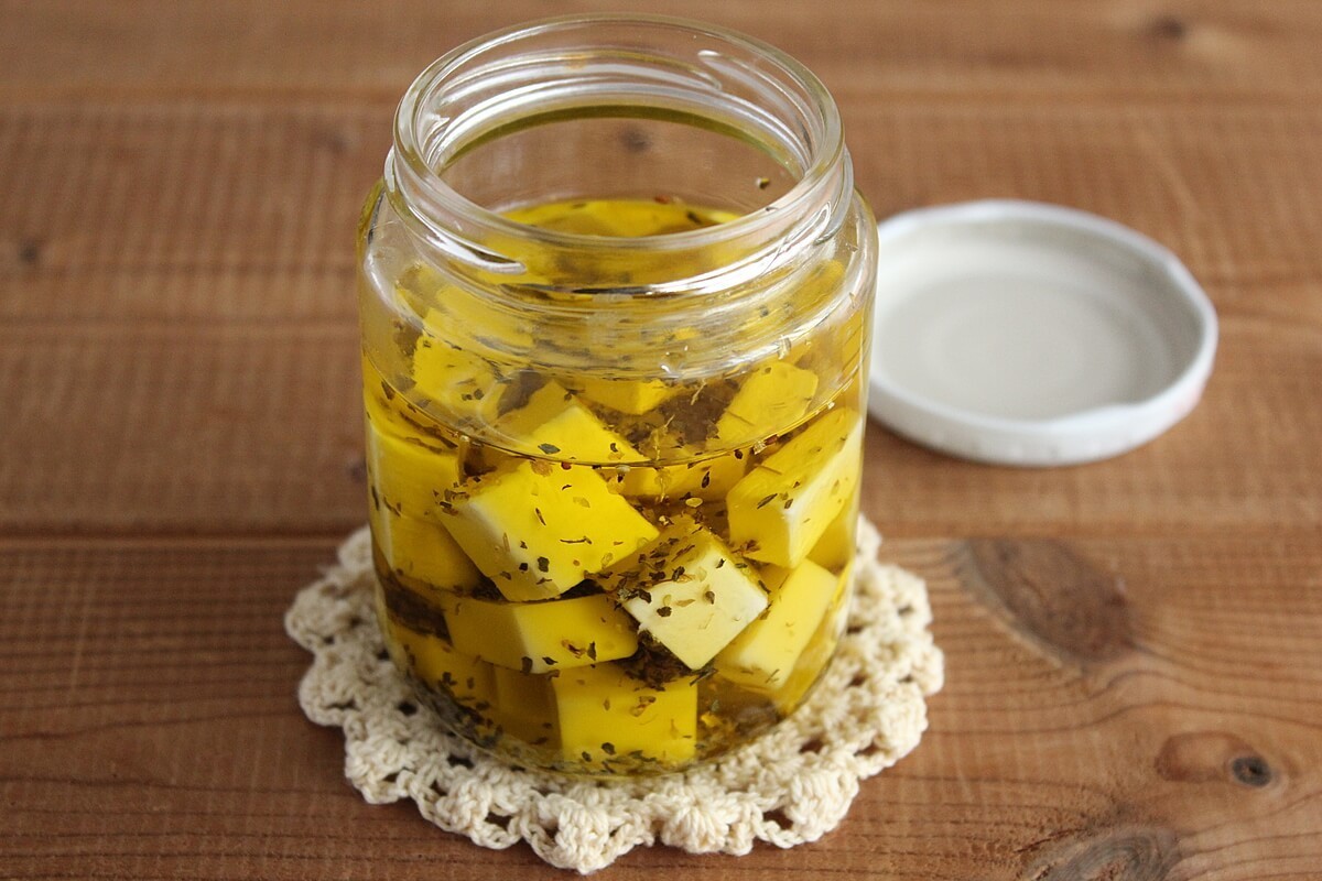 チーズを1.5cm角ほどの大きさにカットして、ドライハーブと共にオリーブオイルに漬けます。
