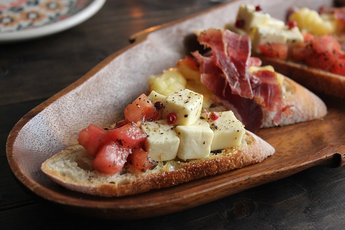 軽く焼いたバゲットに、オリーブオイル漬けのチーズをのせ、トマトを添えました。