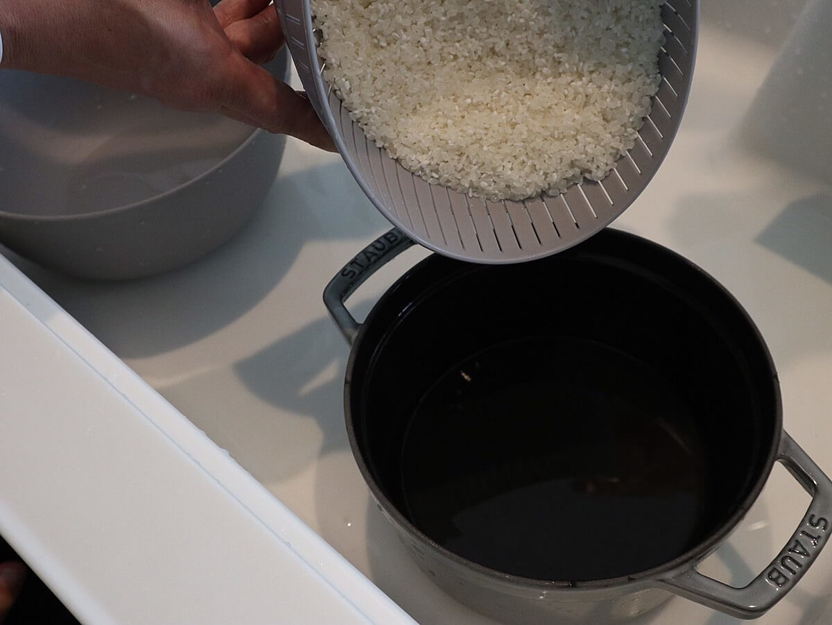 簡単にお米の水切りができ、ザルからストウブに移す作業も柔らかいシリコン製なのでラクラク!