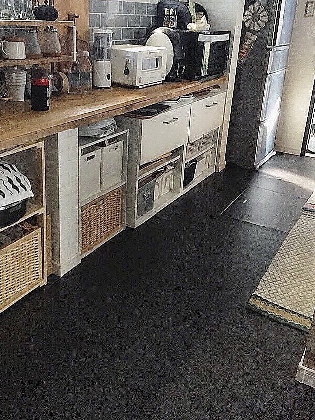 キッチンにはフロアークッションを使って床の模様替えをしました。