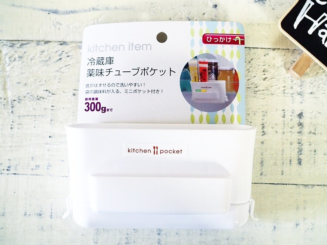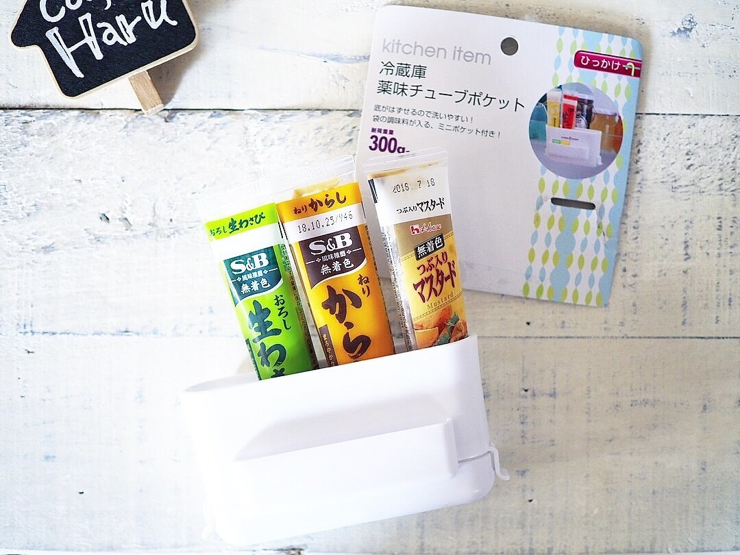 やはり、ここは専用のグッズに頼るしかない!というわけで、セリアの「冷蔵庫薬味チューブポケット」を購入。