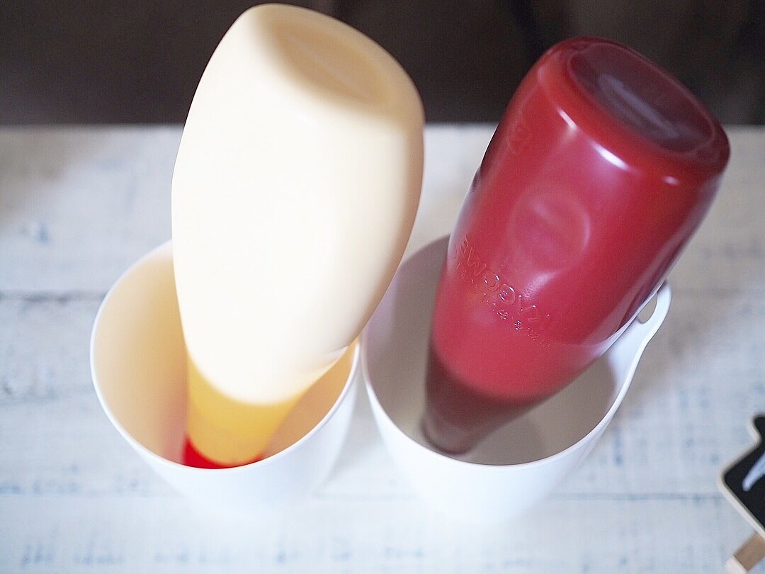 不安定なペンやハサミなどを立てられる形なだけあって、マヨネーズやケチャップの重いボトルの逆さ収納にも耐えてくれました♪