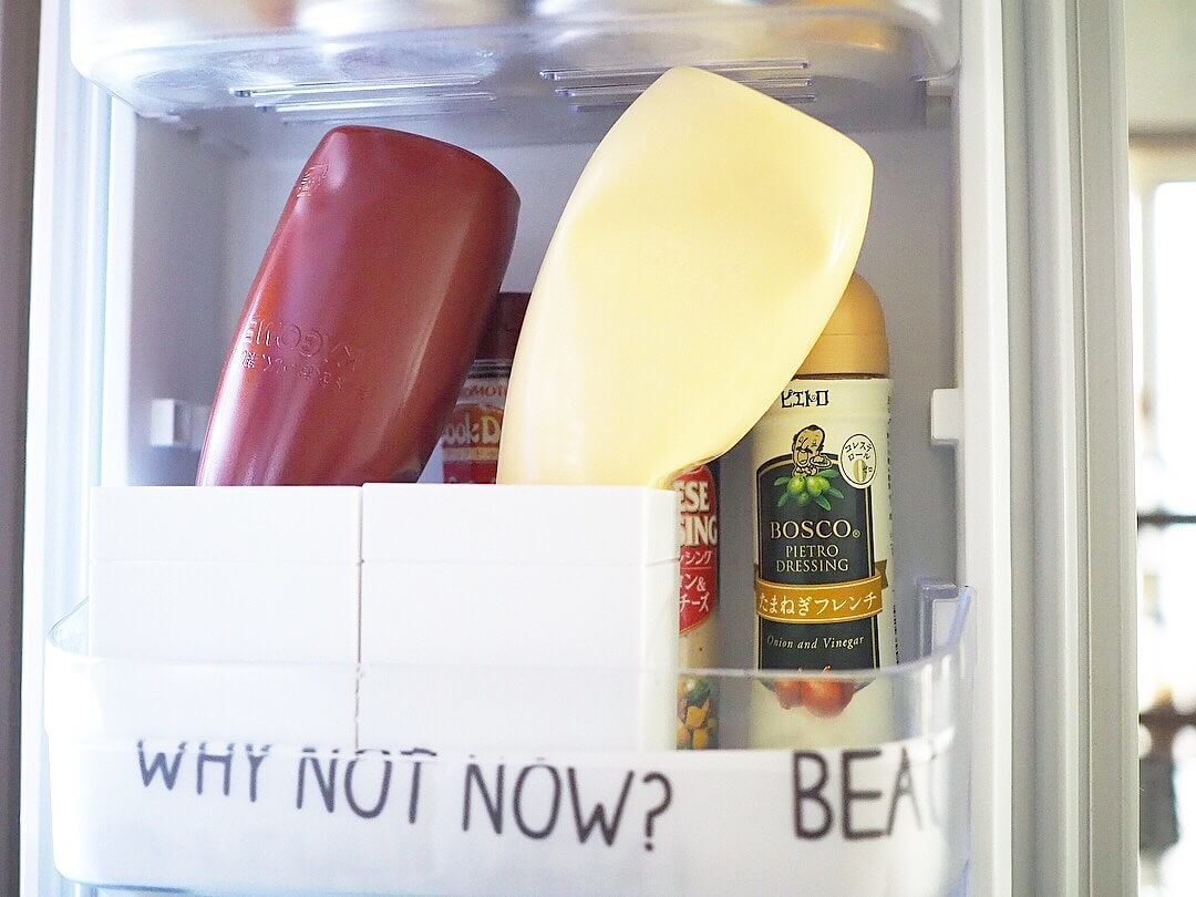 冷蔵庫のドアポケット部分にマヨネーズやケチャップのボトルを立てておくと、冷蔵庫の開閉時にバタバタ倒れてしまうプチストレス。
