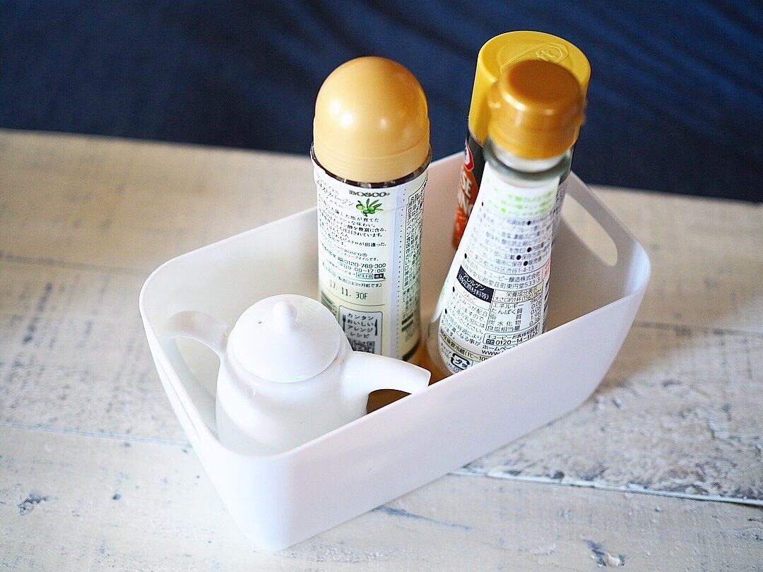 スリムな形のケースには、ドレッシングやポン酢を入れています。