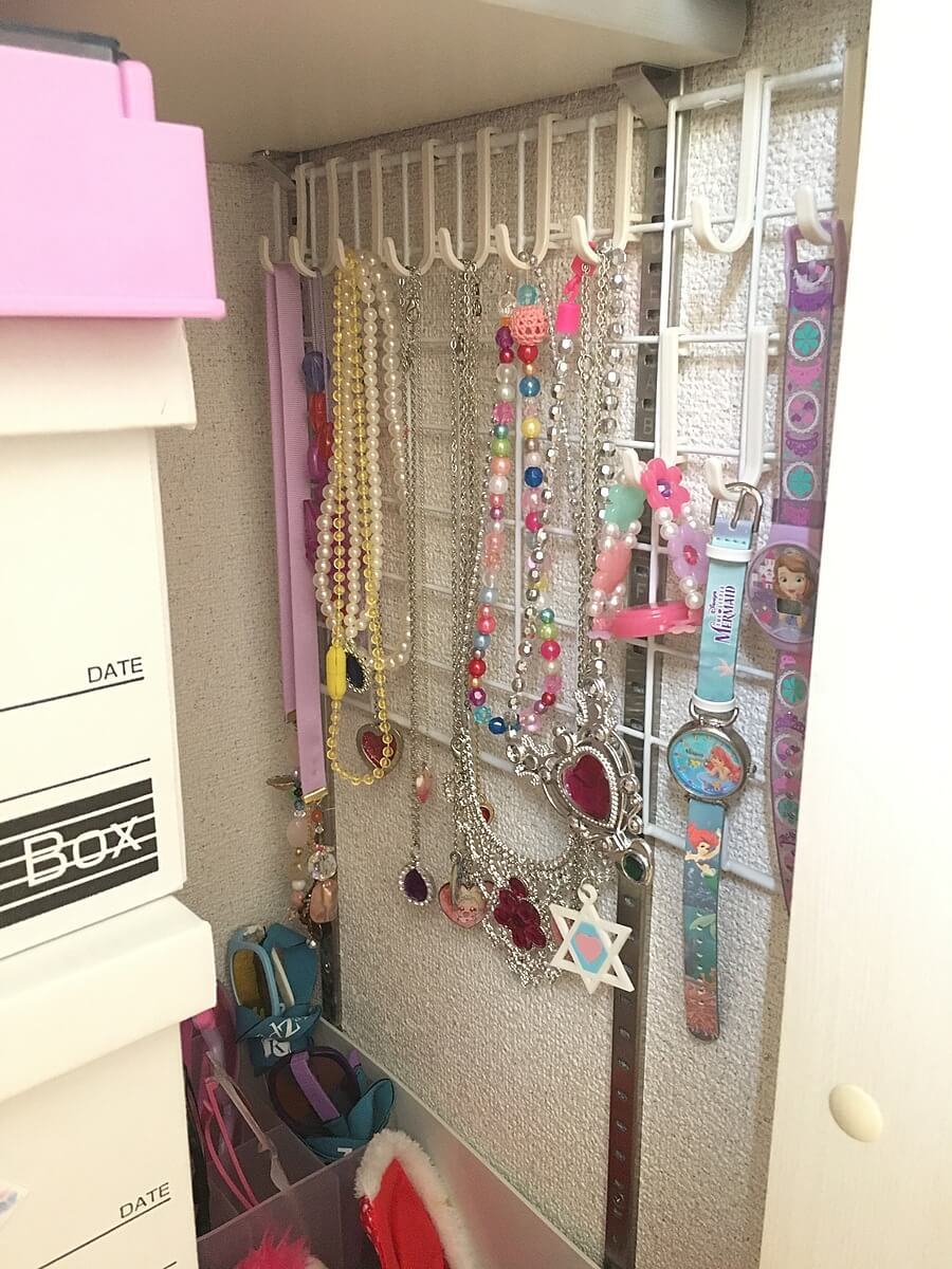 棚受けを利用してワイヤーネットを引っ掛け、専用のフックを使ってネックレスや時計の収納に♪