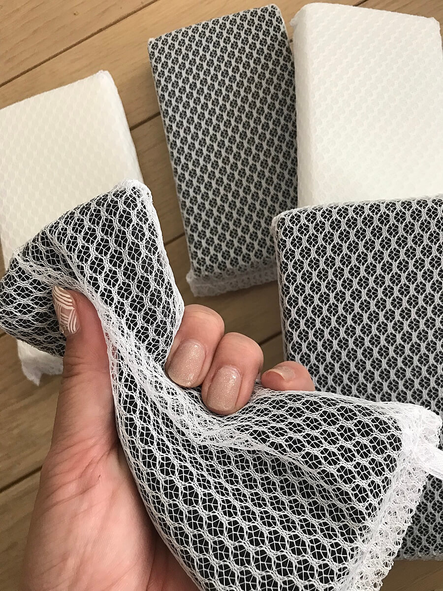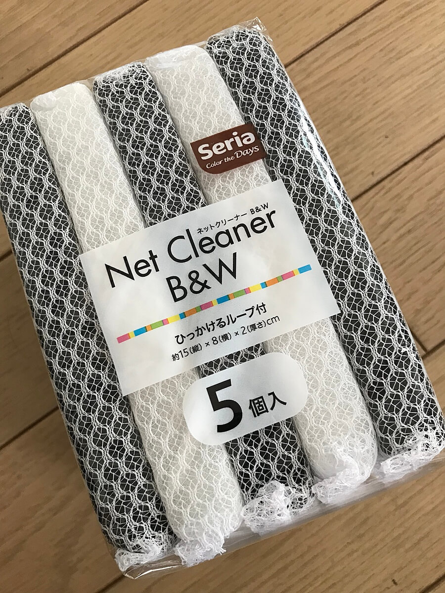 個人的に、ハード系なスポンジよりも、ソフト系なスポンジが好きなのですが、Seria印のこのネットクリーナーは黒白モノトーンで5個入り100円(税抜)