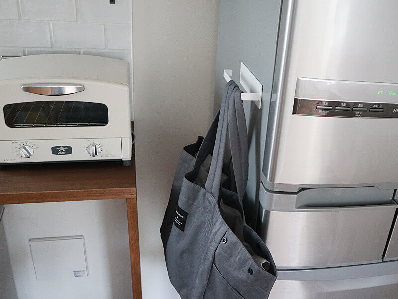 冷蔵庫横にももちろんくっつきました。湿った買い物バッグや袋の一時干しにも便利です。