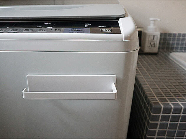 以前使っていたマグネットのフックは、磁力が弱く洗濯機の振動でズルズル、気付くと床スレスレの位置に!