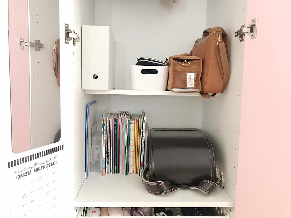学校に行く準備はここで完結するように洋服・教科書・ランドセル・タオルや給食セットを収納しています。