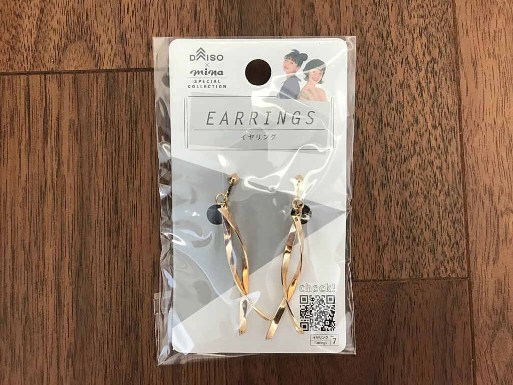 シンプルなゴールドのイヤリングなんですが、この形が100円ぽくなくていいですよね。上品で、かっこよくも使えていいなと思いました。