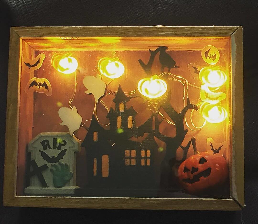セリアのコレクションケースを上手に活用した、手作りハロウィンオブジェです。ライトが入っていたりと、とってもセンスの光る逸品!コレクションケースは、ハロウィンの雰囲気に合うようにペイントしているのだそう。