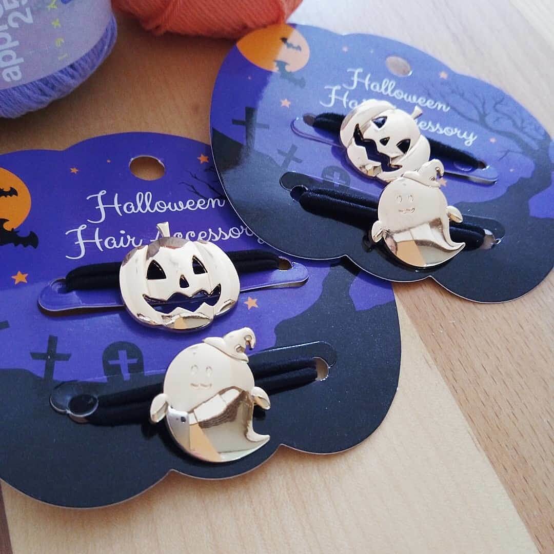 撮影したらシルバーっぽく写ってしまいましたが、ゴールドのヘアゴムがシンプルでおしゃれ。お化けとジャック・オー・ランタンが一つずつのセットになっています。ヘアアレンジのアクセントにするだけでハロウィンらしさがプラスされるアイテムです。