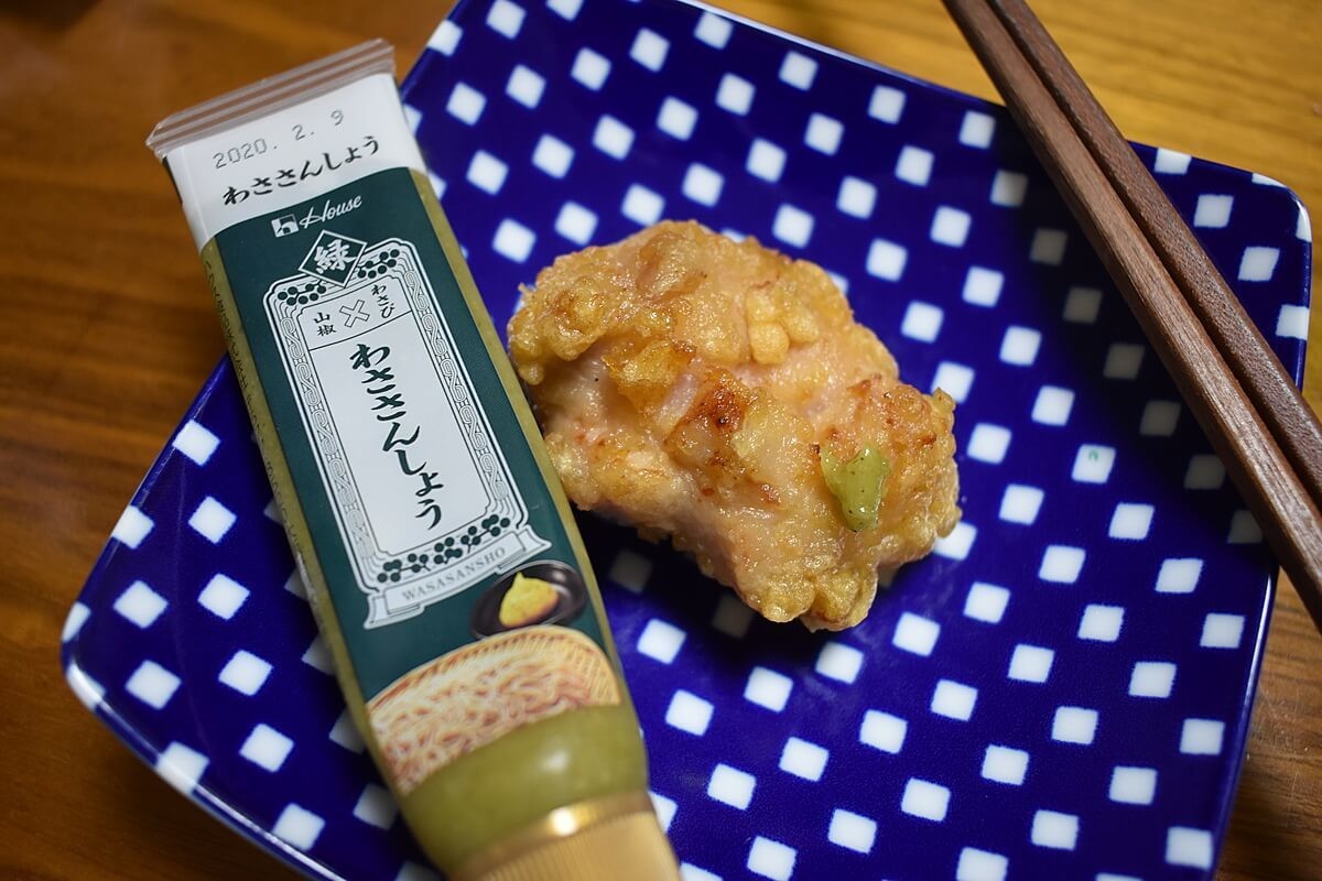 肉に合うなら、から揚げに合わせてみたい!……と、いつもはレモンだけかけて食べる派ですが、わささんしょうをつけてみました。