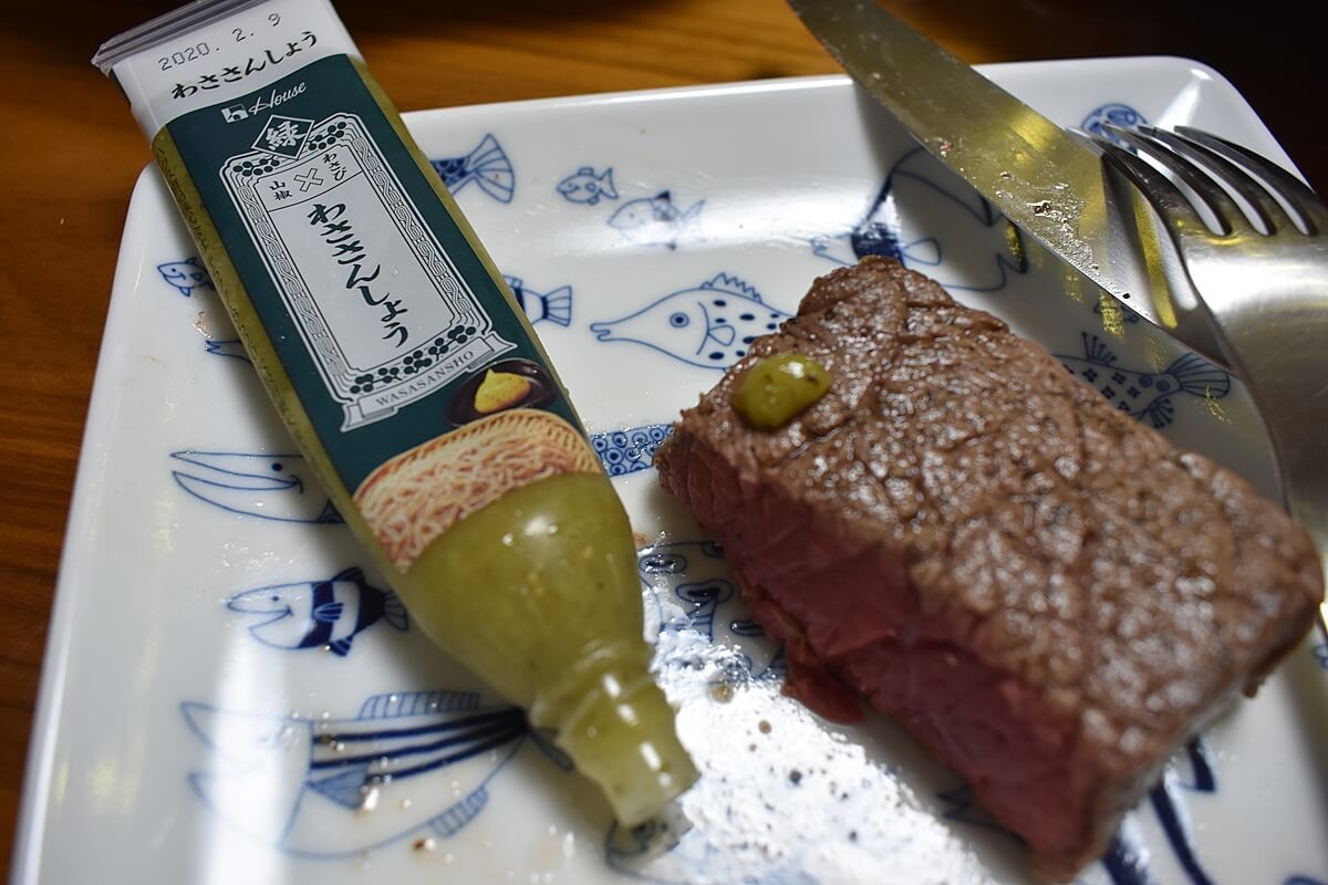 個人的には肉との相性は抜群に良く、そして「わささんしょう+醤油」はもはや大人向けの新感覚ステーキソースといってもよいほどでした。