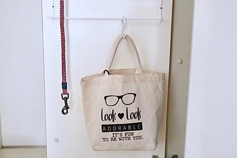 お散歩グッズは玄関にある収納の扉裏に掛けてます。