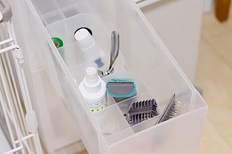 バリカンやブラシ、おやつなども意外と場所とりますよね。 これは、全部まとめて無印良品のスリムなポリプロピレンケースに入れました。