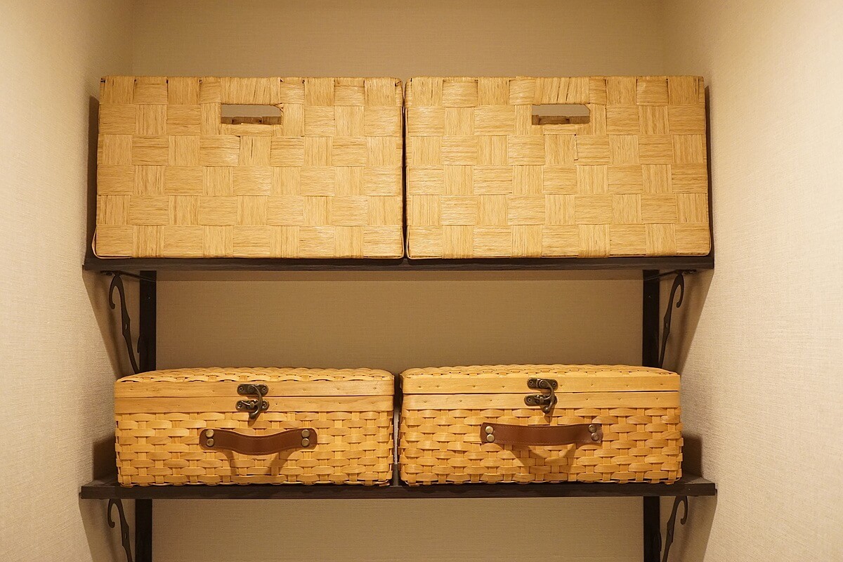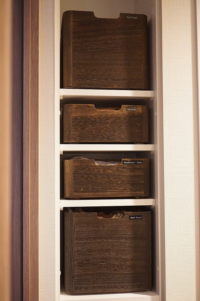 我が家では、脱衣所の収納棚に桐バスケットを置いています。
