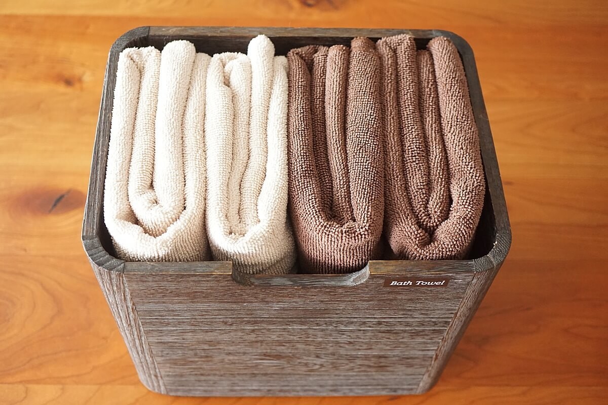 桐バスケットブラウン(ハーフ)には、薄手のバスタオル4枚を収納。