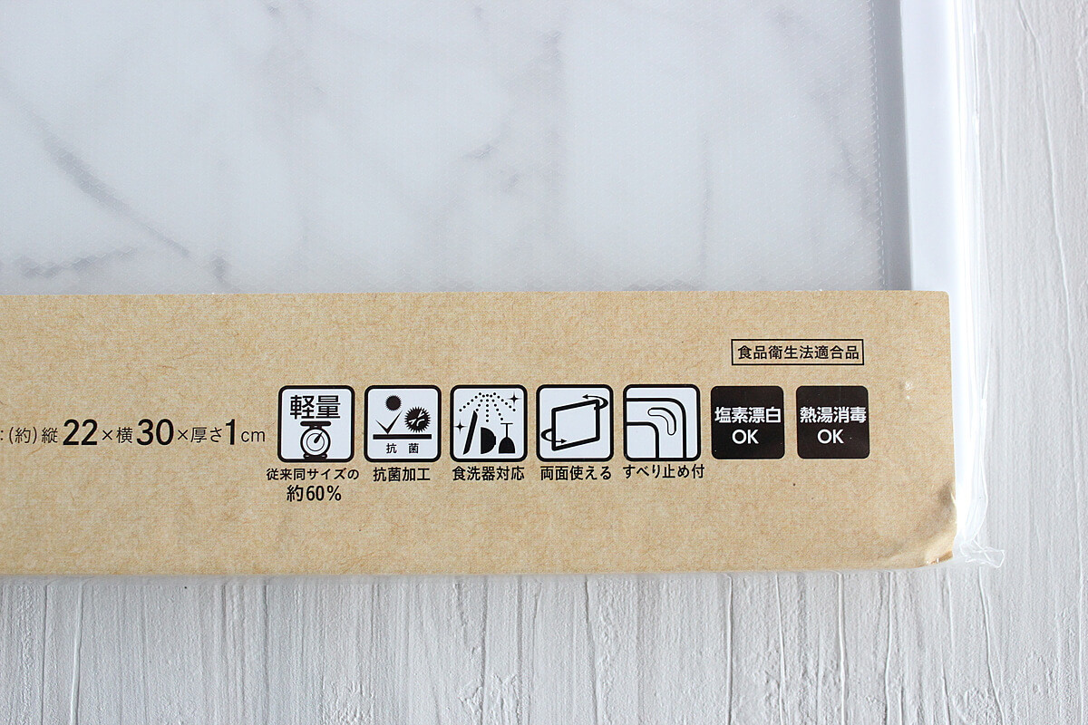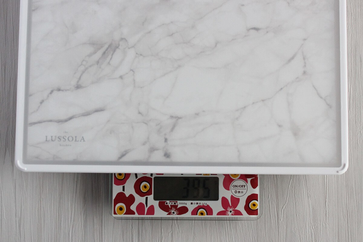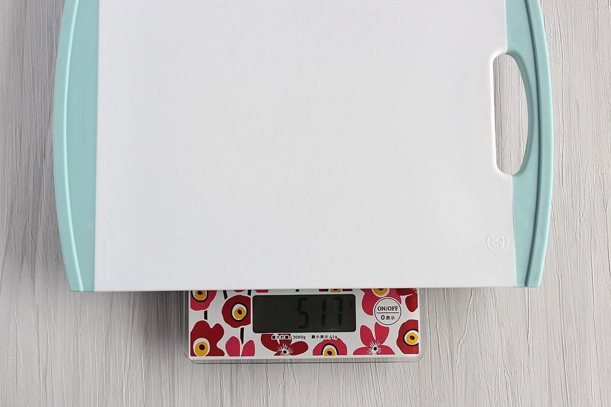 今回購入したカインズの軽量デザインまな板は395gですので、122gも軽いことになります。