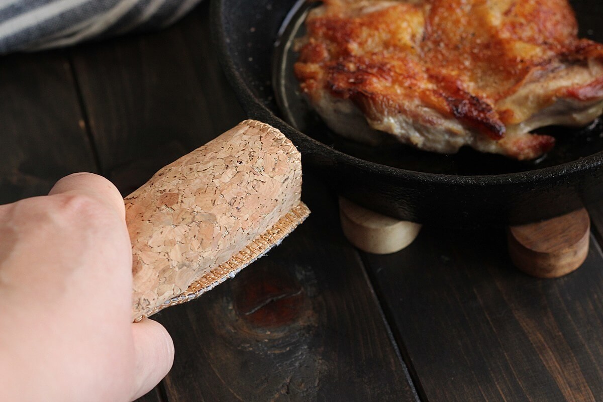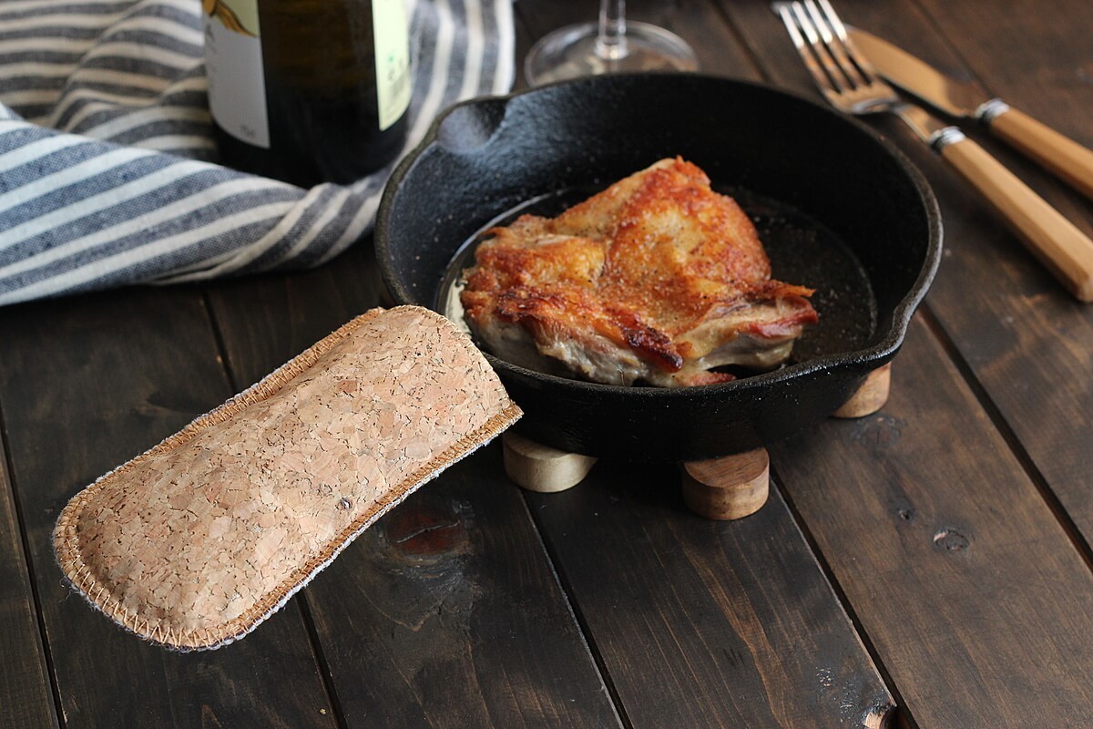 チキンを焼いた熱々のスキレットにコルクカバーをかぶせ、テーブルまで運んでも、熱くならずに持っていることができます。 コルクの他には、グレーとホワイトカラーがありますよ。
