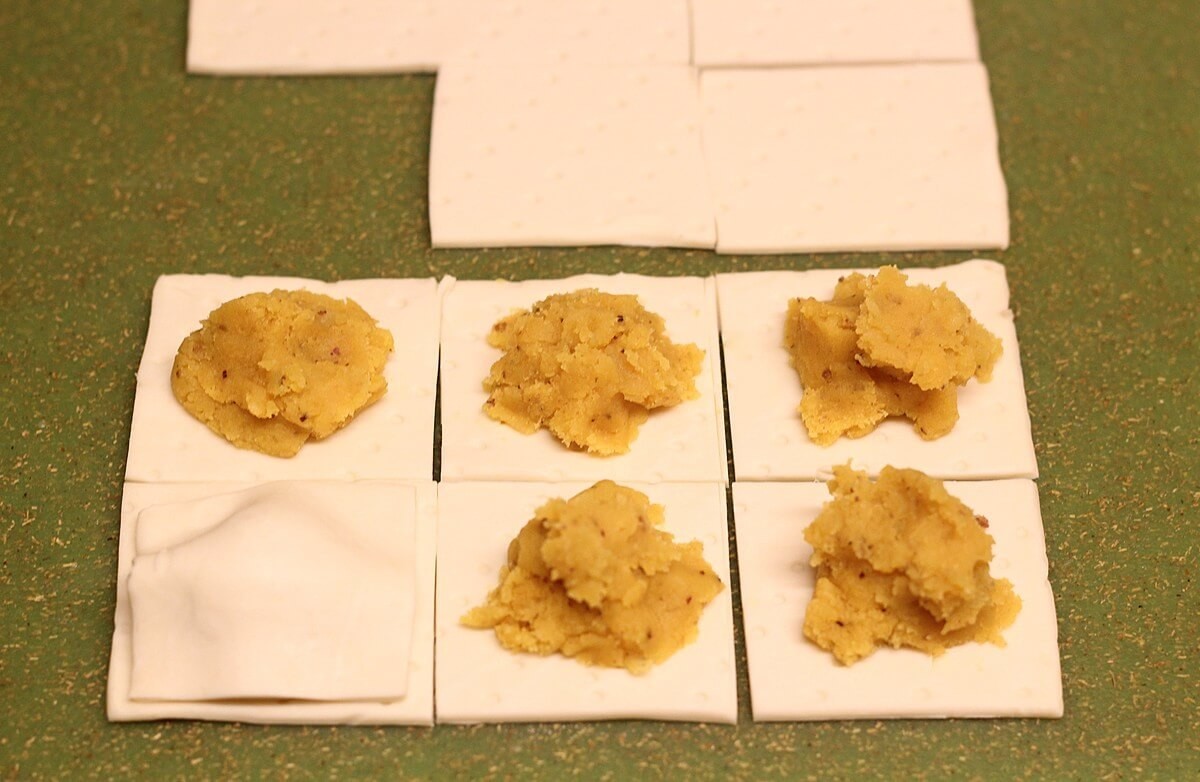 【1】冷凍パイシートを6等分して、レンジで解凍したスイートポテトをのせて、やや崩しておく。