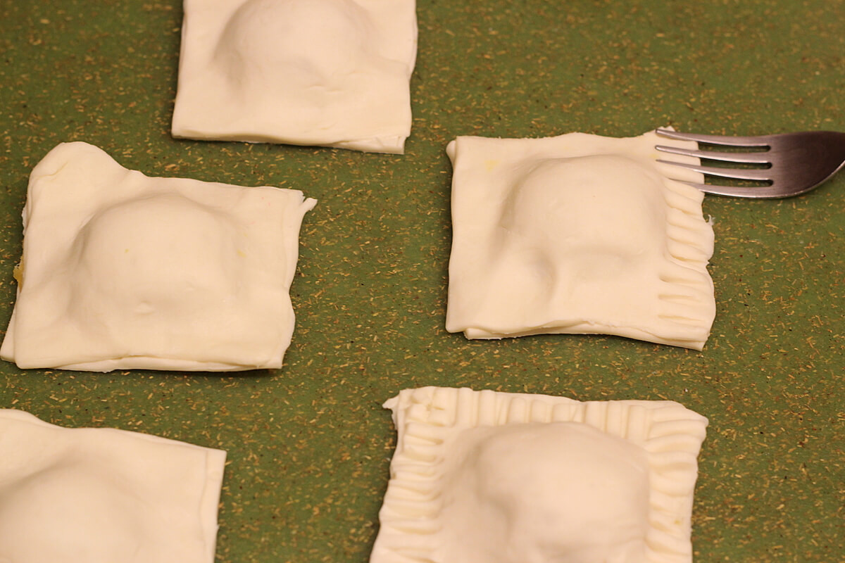 【2】合わせたところをフォークなどで強く抑え、フィリングが出てこないようにする。
