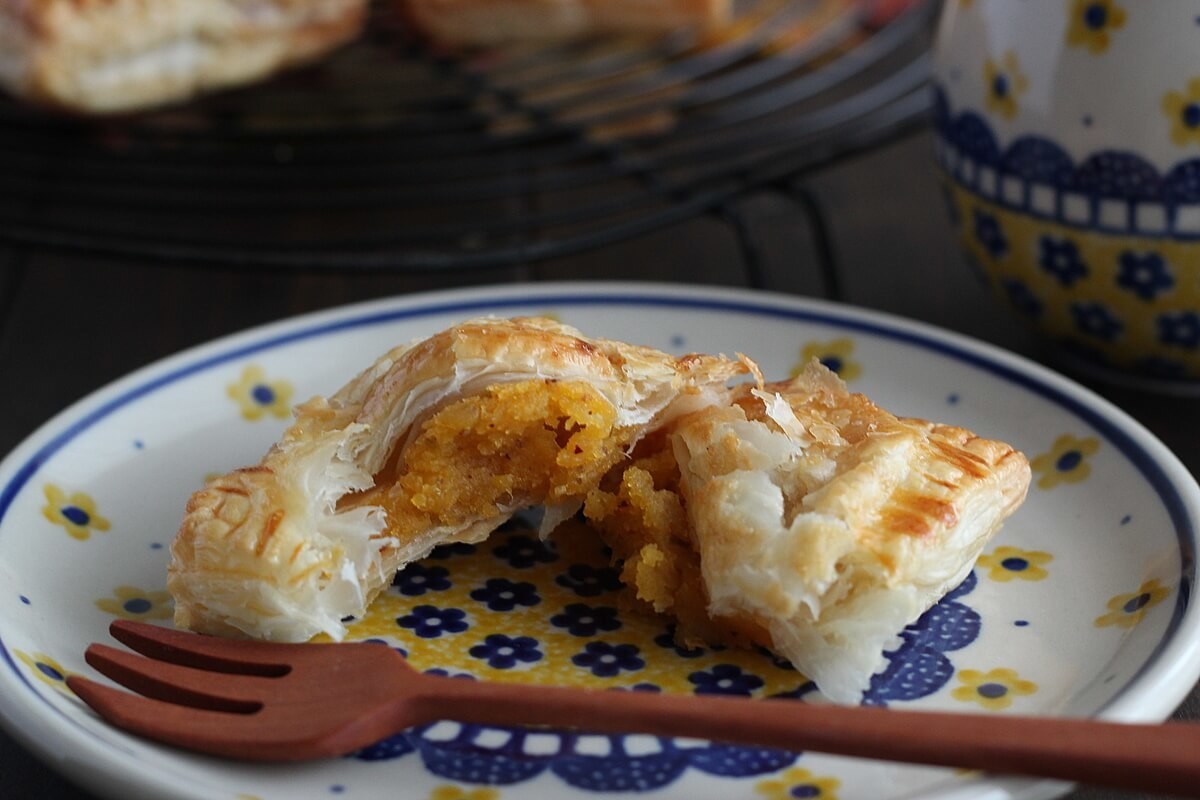 レンジ加熱したスイートポテトを、市販の冷凍パイシートに包んで簡単にできる、スイートポテトパイを作りました!