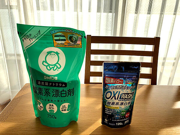 100円ショップでも購入できる「オキシウォッシュ」、ホームセンターなどでも購入できるシャボン玉石けん・酵素系漂白剤などもおすすめです。
