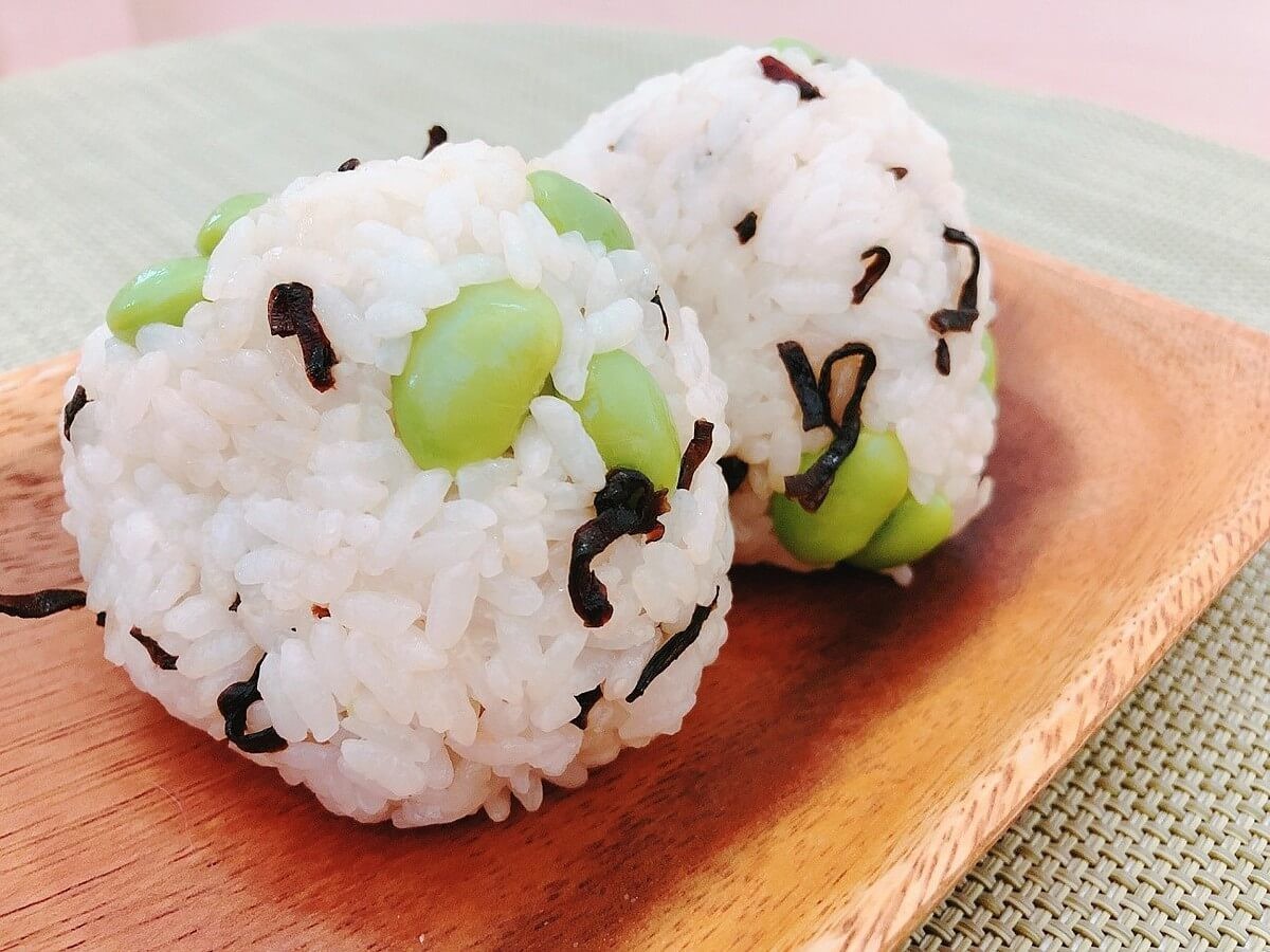 (2)炊きあがったご飯に(1)の枝豆と塩こんぶを入れて混ぜ、おにぎりを作ったら完成♪