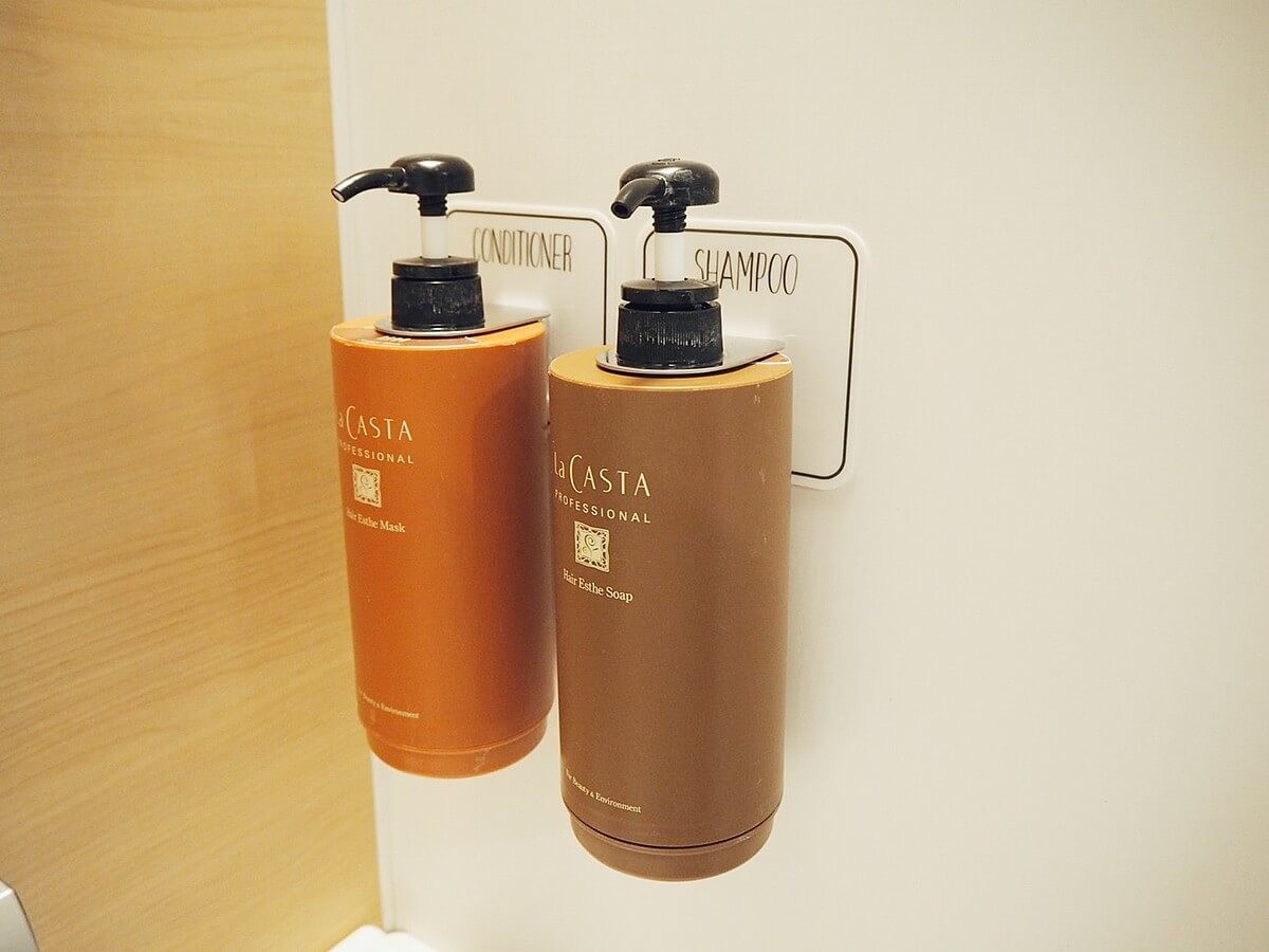 シャンプーボトルは、「マジックシートのボトルホルダー」を使って浮かす収納。