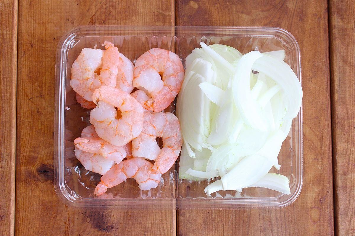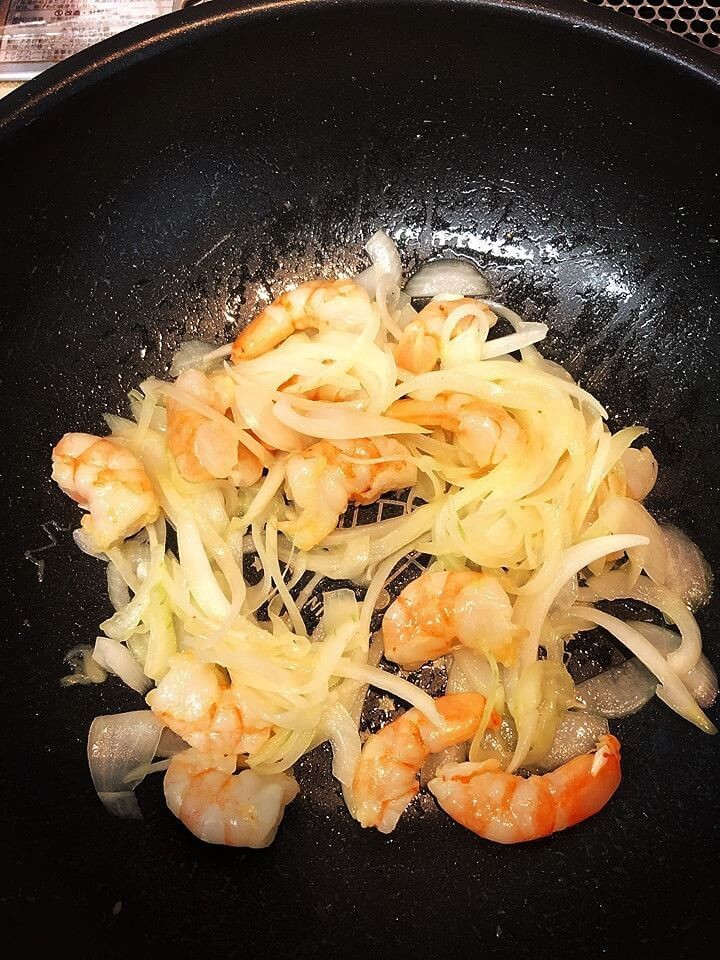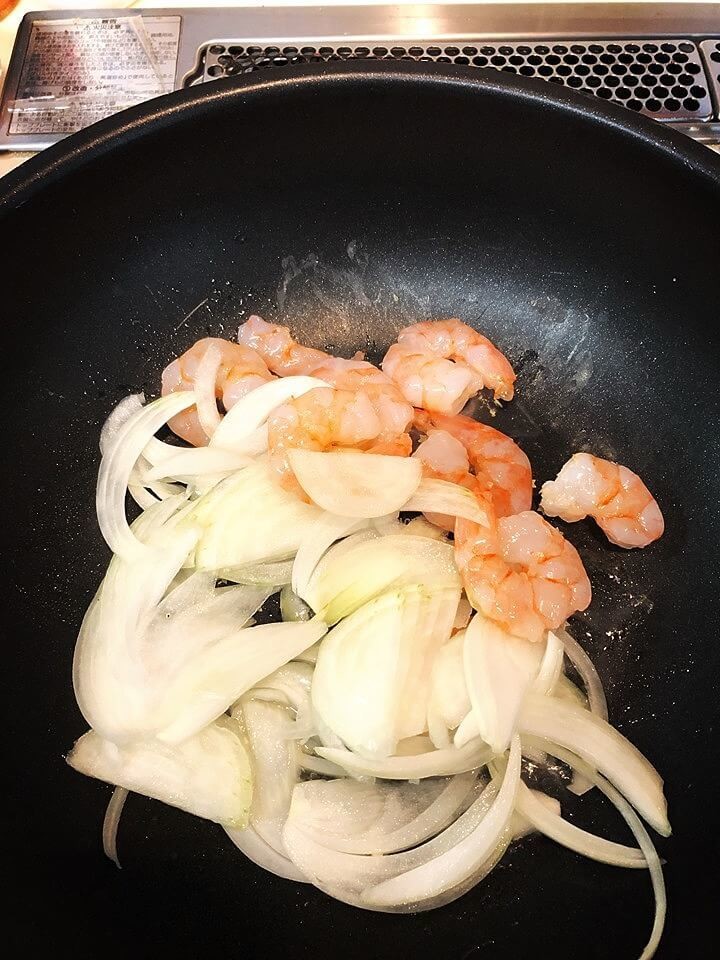 1、フライパンを火にかけ、温まったら大さじ1の油をしいて、海老と玉ねぎを入れて中火で炒めます。