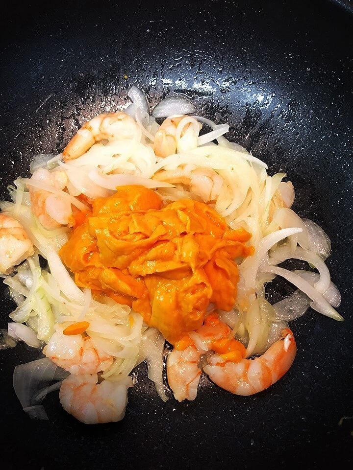 2、玉ねぎがしんなりしたら、海老ドリアの素を入れます。